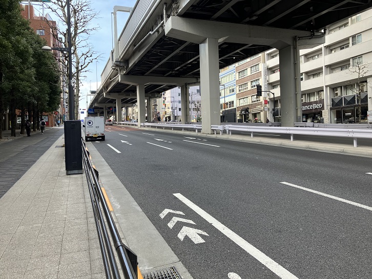 六本木通りの寄席坂入口付近から六本木交差点まで坂道が上っています。頭上には首都高3号渋谷線が通っています。