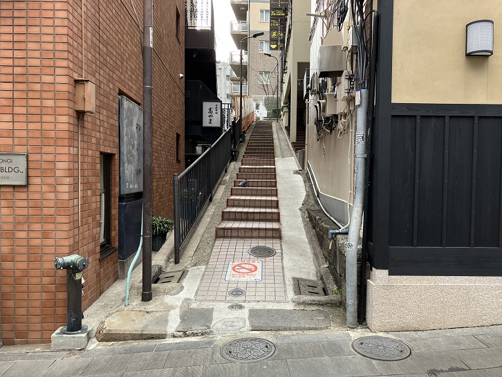 六本木通りの三河台公園のはす向かいに、ビルに挟まれた狭い階段が上がっています。