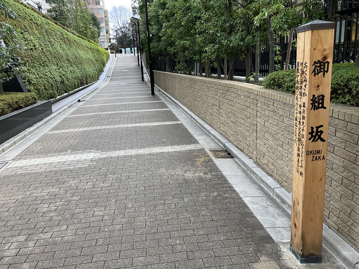 御組坂(おくみざか)は長さが約90mほどの坂で、坂名は江戸幕府御先手組の屋敷が坂の南にあったことに因みます。坂上と坂下付近に案内柱が立っています。
