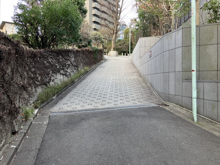 サウジアラビア大使館の先を左折し、そのまま進みますと左手に短い坂が下っています。