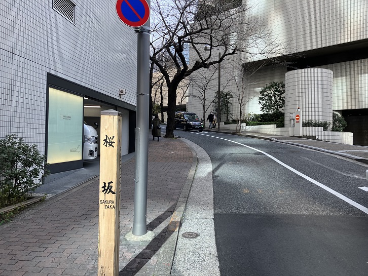 桜坂は長さが約75mほどの緩やかに上る坂で、戦災に遭うまで坂の途中に大きな桜の木があったことからこの坂名が付けられました。現在でもアークヒルズが建設された際に植えられた桜の樹が坂道の両脇に多く立ち並んでいます。坂下と坂上付近に案内柱が立っています。