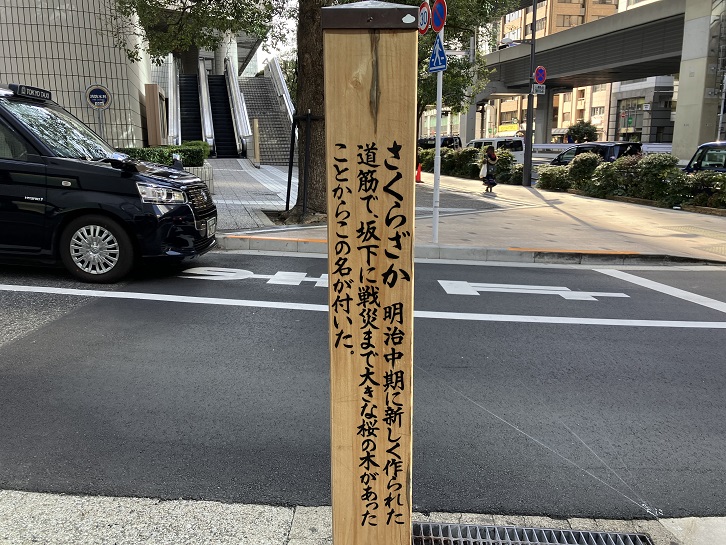 さくらざか 明治中期に新しく作られた道筋で、坂下に戦災まで大きな桜の木があったことからこの名が付いた。