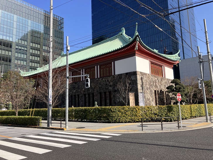 大倉集古館は日本初の私立美術館で、日本や東洋の古美術を中心に収蔵しています。明治から大正期にかけて大きな財を成し、大倉財閥を創始した大倉喜八郎が長年に亘って収集した古美術・典籍類を収蔵・展示するため、大正六年(1917年)に邸宅の一角に財団法人大倉集古館として開館しました。開館からまもない大正十二年(1923年)に関東大震災によって当時の展示館と一部の展示品を失い、一時休館を余儀なくされましたが、伊東忠太の設計と大成土木(現在の大成建設)による施工で再建され、耐震耐火の中国風の展示館が昭和二年(1927年)に完成し、翌年再開館しました。この建築は展示室から長い回廊が伸び六角堂を経て表門に至る壮大なものでした。大倉喜八郎の死後は、その嫡男である大倉喜七郎が近代日本画などの収蔵品の充実に努めました。太平洋戦争時の空襲も乗り越えましたが、戦後になって敷地内にホテルオークラが建設されることになり、一部の建物が整理・解体されました。竣工以来50年が経過して老朽化が顕著になったホテルオークラ本館の建て替えに伴って大倉集古館もリニューアルされることになり、谷口建築設計事務所の設計と大成建設の施工で、周りに増築されていた部分を撤去した上で約6m曳家され、免震構造の地下階の増築によってロビーやショップ・ホールなどが設けられ、令和元年(2019年)9月12日に再開館しました。