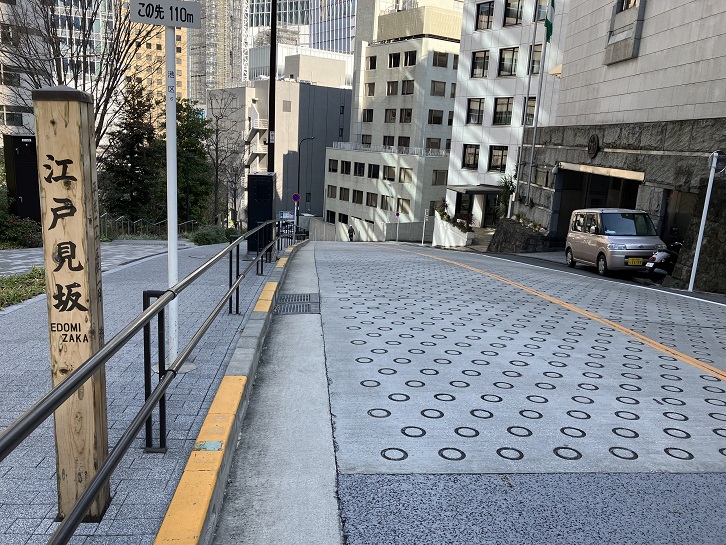 江戸見坂は長さが約150mほどの急な上り坂で、坂の中ほどで僅かに右方向に曲がっています。坂上付近は超急坂になっています。坂上から江戸の市街が眺望できたことからこの坂名が付けられました。坂上と坂下付近に案内柱が立っています。