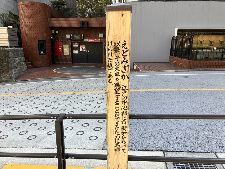 えどみざか 江戸の中心部に市街がひらけて以来、その大半を眺望することができたために名づけられた板である。
