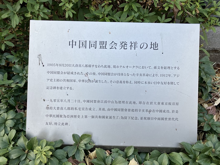 1905年8月20日大倉喜八郎邸すなわち此地、現ホテルオークラにおいて、孫文を総理とする中国同盟会が結成された。その後、中国同盟会が母体となった辛亥革命により、1912年、アジア史上初の共和国家、中華民国が誕生した。その意義を称え、同時に末永い日中友好を期して記念碑を建立する。