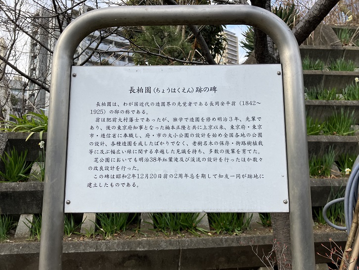 長柏園は、わが国近代の造園界の先覚者である長岡安平翁(1842年〜1925年)の邸の称である。翁は肥前大村藩士であったが、独学で造園を修め明治三年、先輩であり、後の東京府知事となった楠本正隆と共に上京以来、東京府・東京市・逓信省に奉職し、府・市の大小公園の設計を始め全国各地の公園の設計、各種造園を成したばかりでなく、老樹名木の保存・街路樹植栽等に及ぶ幅広い緑に関する卓越した見識を持ち、多数の後輩を育てた。芝公園においても明治三十八年紅葉滝及び渓流の設計を行ったほか数々の改良設計を行った。この碑は昭和二年12月20日翁の2周年忌を期して知友一同が跡地に建立したものである。
