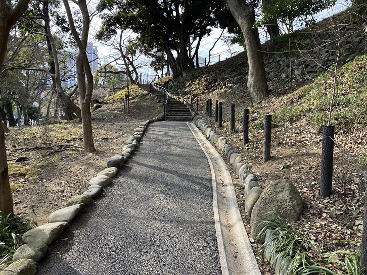 丘の上に登るには、@東京タワー側から上る短い階段・A南から北に上る階段・B北から南に上る階段の3つのルートがあります。もみじの滝からですと、Aのルートを使います。