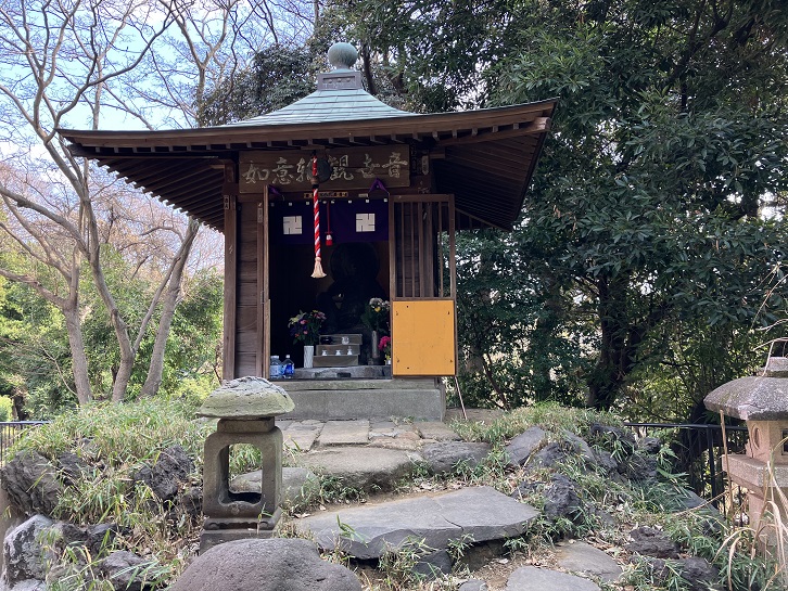 この丘は富士見台といわれ、丘の上には西向観音堂があります。鎌倉幕府五代執権の北条時頼が観音山(現在の東京タワー敷地)に辻堂を建て、鎌倉街道に向けて石仏を安置しました。西向観世音として信仰を集め、子育て・安産に霊験あらたかと伝えられています。昭和五十年(1975年)に現在の地に遷座され、昭和五十五年(1980年)にこの観音堂が建立されました。