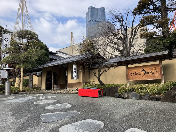 東京タワーから坂を下りたところに「とうふ屋うかい」のお店があります。「とうふ屋うかい」は、東京タワーの麓に広がる約2000坪の敷地に造られた江戸情緒を感じる空間で豆腐と旬の素材を使った懐石料理が味わえる料亭です。八王子に大和田店を創業し、その後ここ芝店を開業しました。