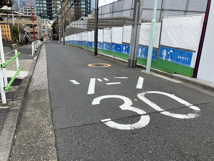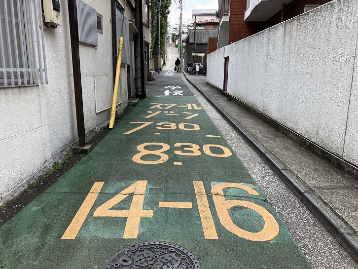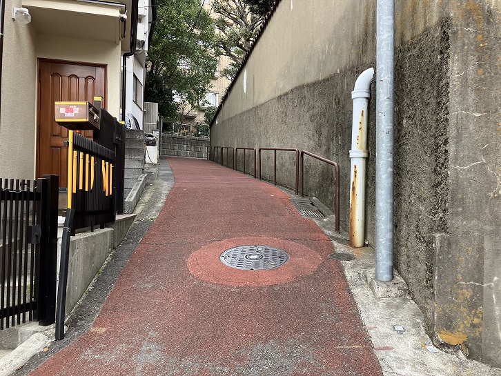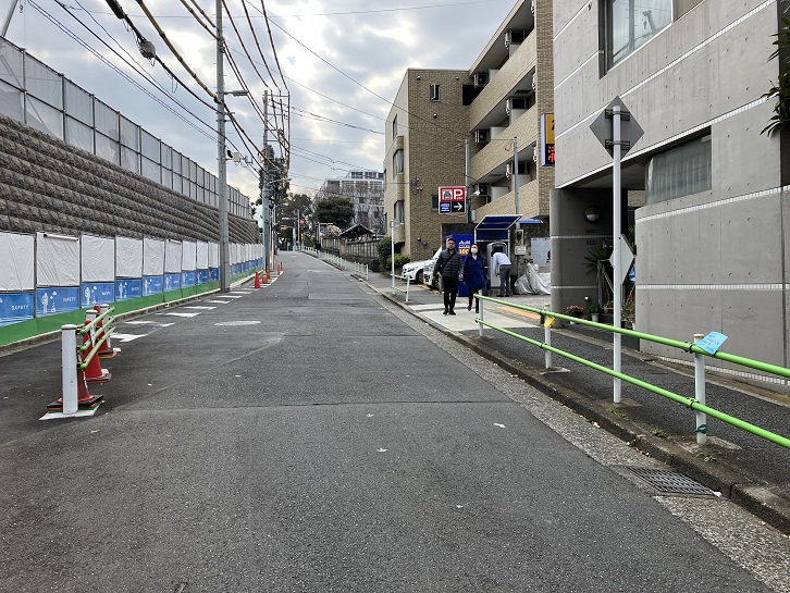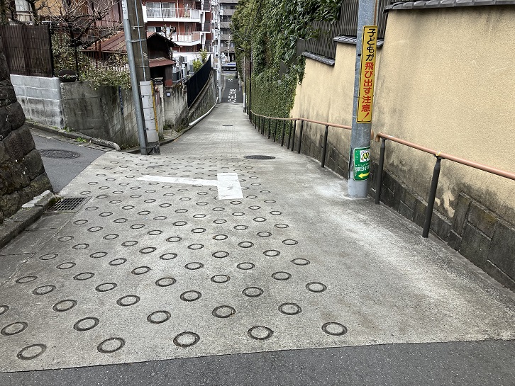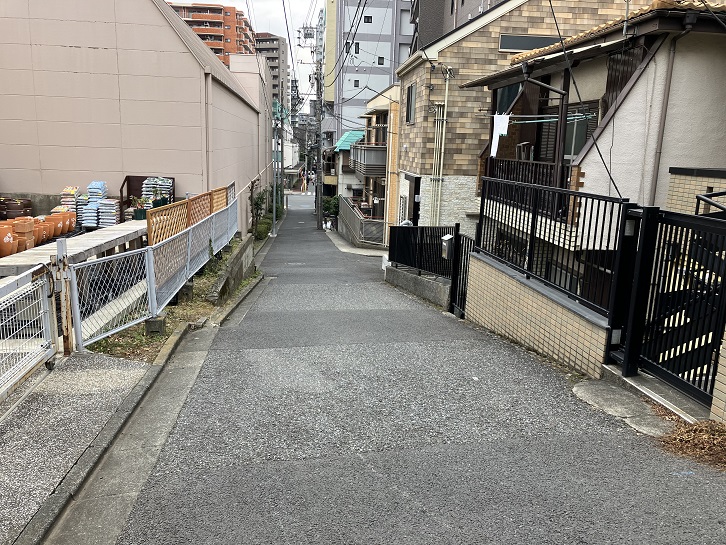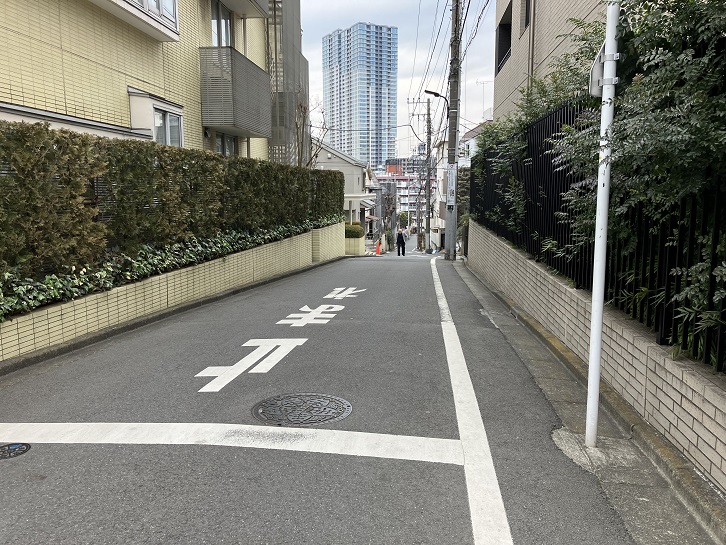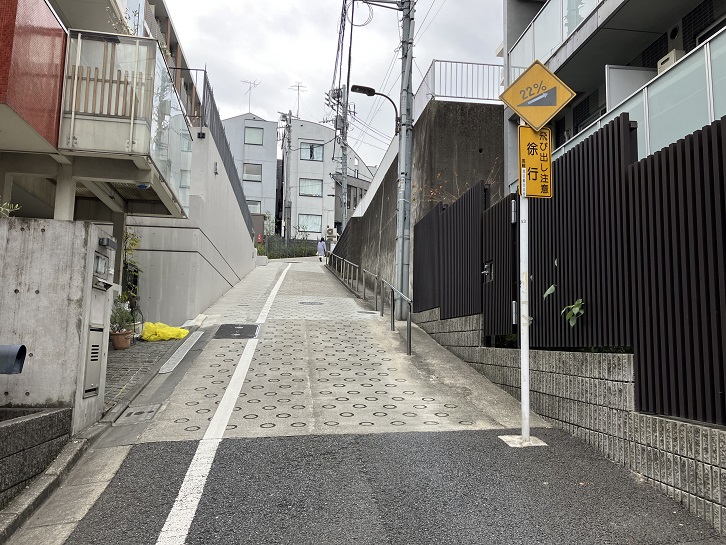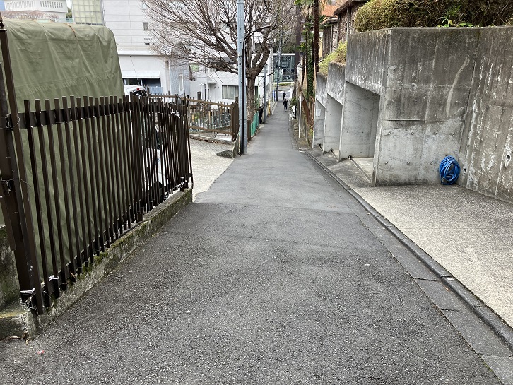 桜田通りの慶應義塾大学の正門のはす向かいから普連土学園の裏手を上がって坂上の曲がり角まで幅の狭い坂が延びています。