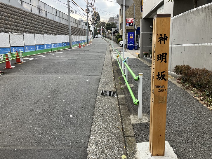神明坂は長さが約110mほどの緩やかな坂で、別名を「馬場坂」といいます。坂下の天祖神社が元神明宮と呼称されることに因んで坂名が付けられました。坂下と坂上に案内柱が立っています。