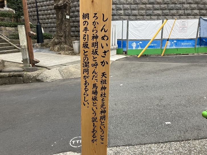 しんめいざか 天祖神社を元神明というところから神明坂と呼んだ。馬場坂という説もあるが、綱の手引坂との混同があるらしい。