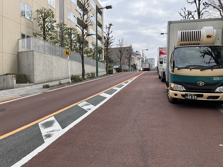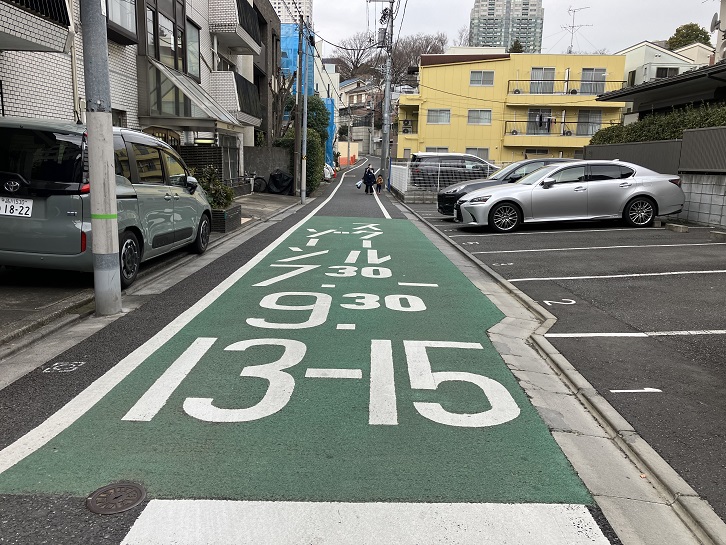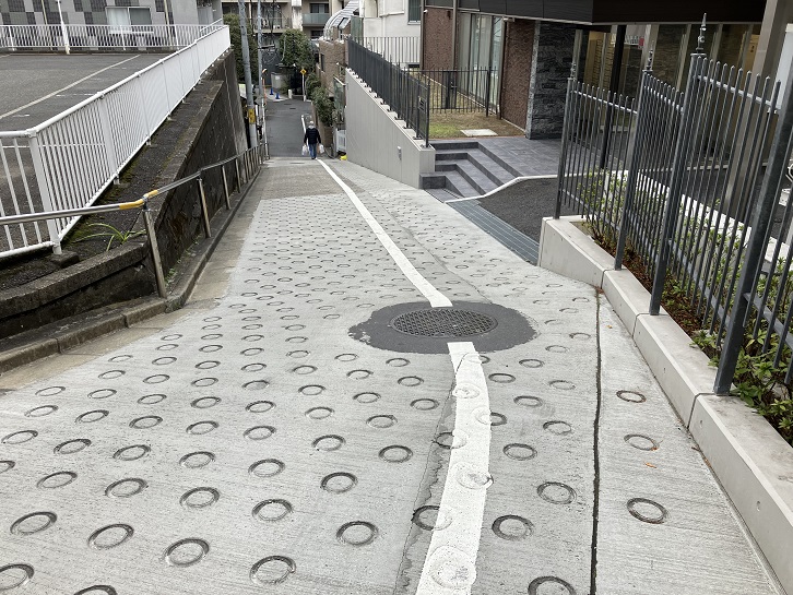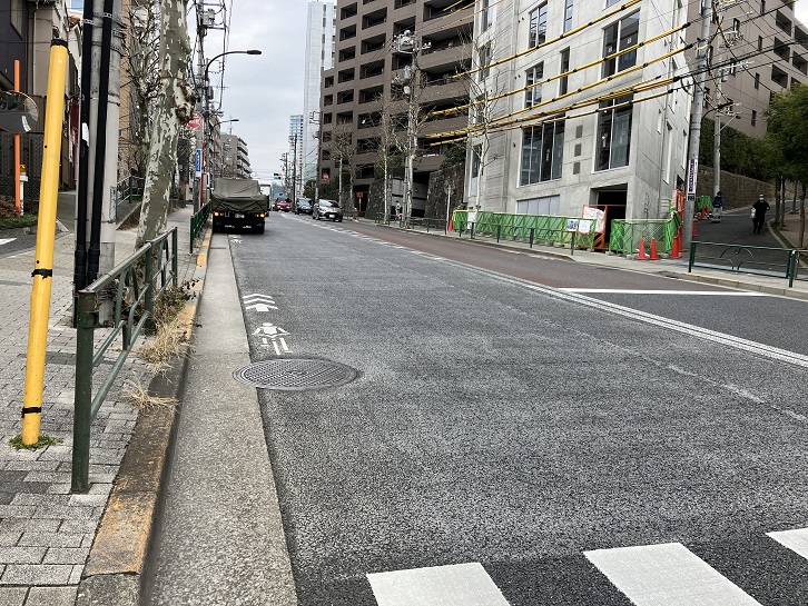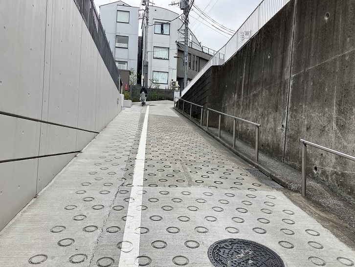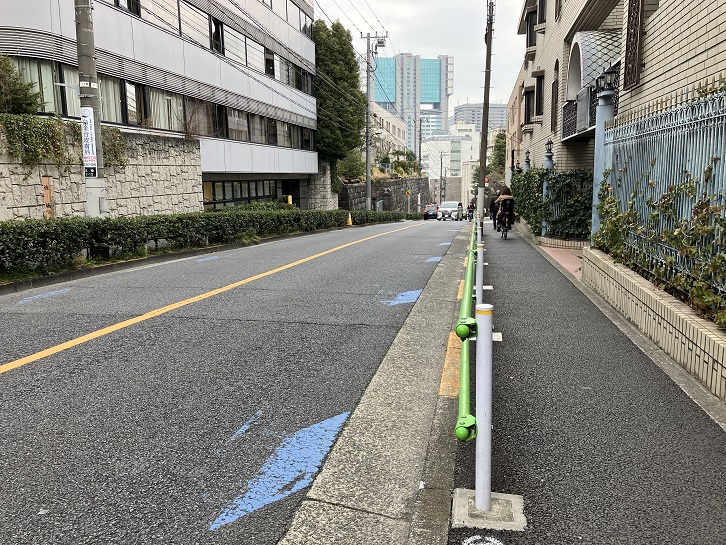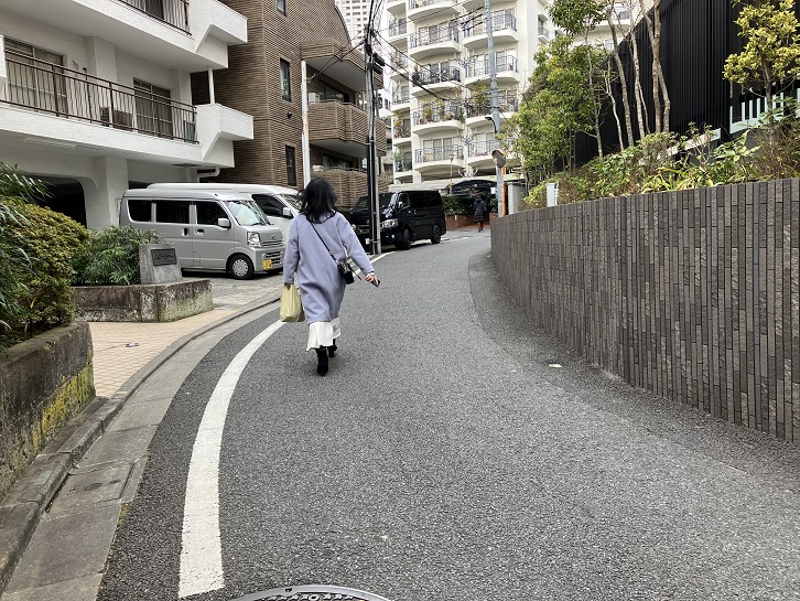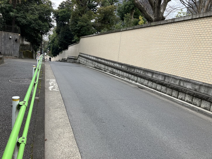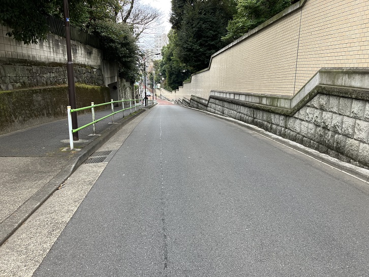 潮見坂の坂下手前から普連土学園の前の通りが長い上り坂になっています。