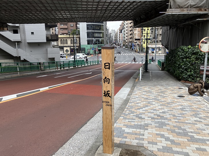 日向坂は長さが約130mほどの急な坂で、別名を「ひなた坂・袖振坂」といいます。江戸時代、坂上付近に徳山藩毛利日向守の屋敷があったことに因んで坂名が付けられました(日向・佐土原藩島津家の可能性もあるのでは?)。坂上と坂の中ほどに案内柱が立っています。