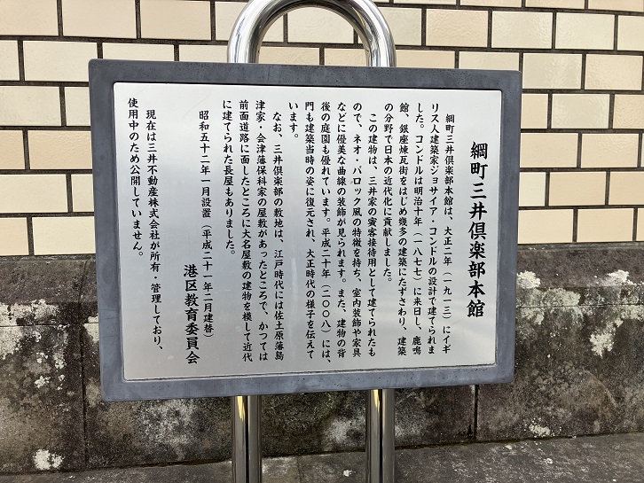 などに優美な曲線の装飾が見られます。また、建物の背後の庭園も優れています。平成二十年(2008年)には、門も建築当時の姿に復元され、大正時代の様子を伝えています。なお、三井倶楽部の敷地は、江戸時代には佐土原藩島津家・会津藩保科家の屋敷があったところで、かつては前面道路に面したところに大名屋敷の建物を模して近代に建てられた長屋もありました。