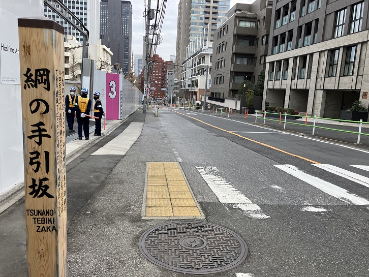 綱坂は長さが約150mほどのかなり急な坂で、別名を「渡辺坂・馬場坂」といいます。坂名は、渡辺綱が付近に生まれたという伝説に因んでいます。坂上と坂下付近に案内柱が立っています。
