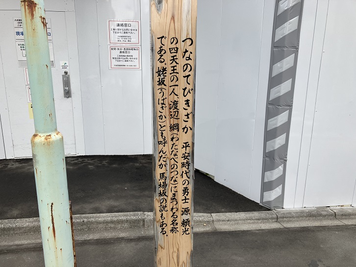 つなのてびきざか 平安時代の勇士源頼光の四天王の一人、渡辺綱(わたなべのつな)にまつわる名称である。姥坂(うばざか)とも呼んだが、馬場坂の説もある。