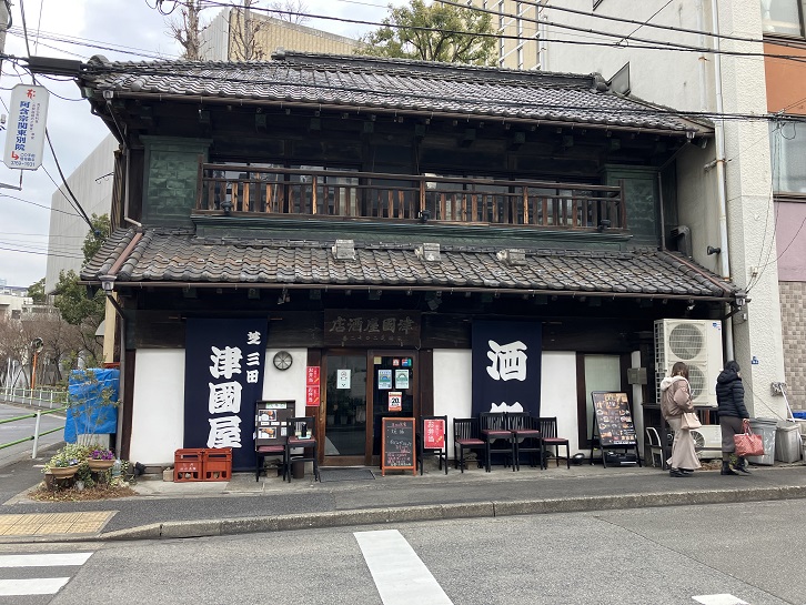 東京には味のある居酒屋さんがありますが、津国屋(つのくにや)もそのひとつでしょう。綱坂下にあり、慶応義塾大学の正門からも歩いて2分ほどのところで、明治期の商家として今も風情を色濃く残す年代物の建物が異彩を放っています。津国屋は、明治元年(1868年)に高輪の津国屋本店から分家して酒屋として創業しました。現在の建物は明治二十六年(1893年)に建てられ。2023年で築130年となりました。木造2階建ての建物は、江戸時代から大正時代までの商家によく見られる軒先を大きく前面に張り出すようにした「出桁(だしげた)造り」と呼ばれる古式構造で建築され、港区の歴史的建造物になっています。また、建物の正面右手には昭和四十年代まで土蔵が隣接し、お酒の保管はその土蔵で行ってきたそうです。50年ほど前から角打ち(酒屋での立ち飲み)を始め、平成十三年(2001年)にリニューアルをして居酒屋になりました。歴史を感じさせる旧商家でのランチタイムには数種類の定食が供され、ボリューム満点でお値段はそこそこ。学生さんでなくても懐の寂しいサラリーマン諸氏には有難いお店です。勿論、夜は日本各地の銘酒が堪能できる本業の居酒屋に変身します。元が酒屋さんだっただけに、豊富な日本酒の品揃えとお手頃価格で、ランチ同様に懐に優しい居酒屋さんです。
