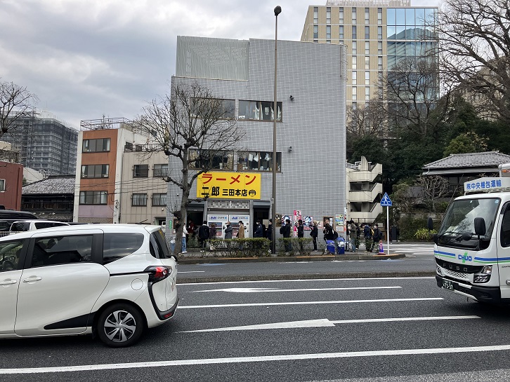 津国屋から路地を挟んだところに、ラーメン二郎三田本店のお店があります。見るからに狭そうな店内ですが、今日も沢山のラーメンおたくがお店の前の歩道に行列しています。ラーメン二郎は「ジロリアン」と呼ばれる熱狂的ファンが多いことで知られ、創業者である山田拓美さんが店主をつとめる三田本店はまさにラーメンの聖地となっています。ラーメン二郎のラーメンは、小さなサイズでもかなりの量で濃厚な豚骨スープが特徴です。