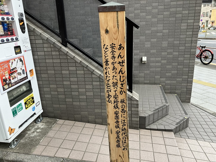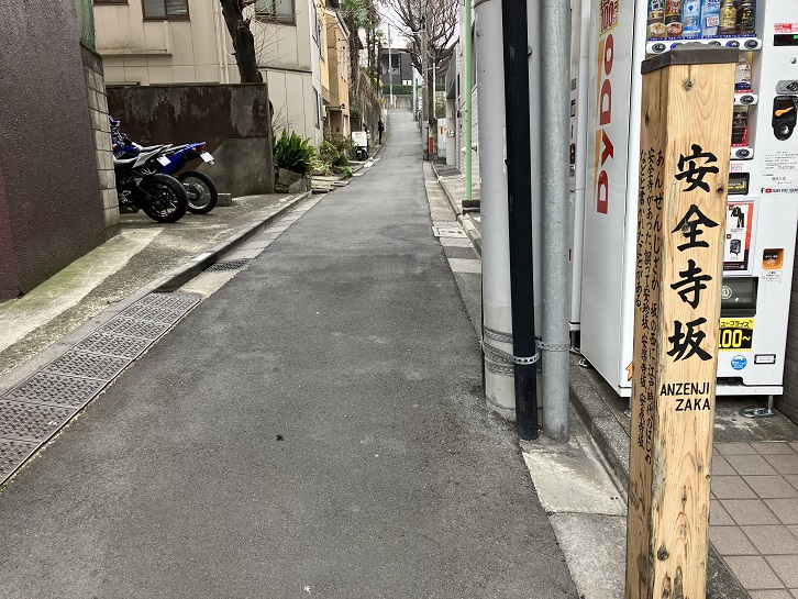 安全寺坂は長さが約85mほどのやや急な坂で、別名を「安珍坂・安楽寺坂・安泉寺坂」といいます。坂名は、江戸時代に坂の西側に安全寺があったことに因んでいます。坂下と坂上の曲がり角付近に案内柱が立っています。