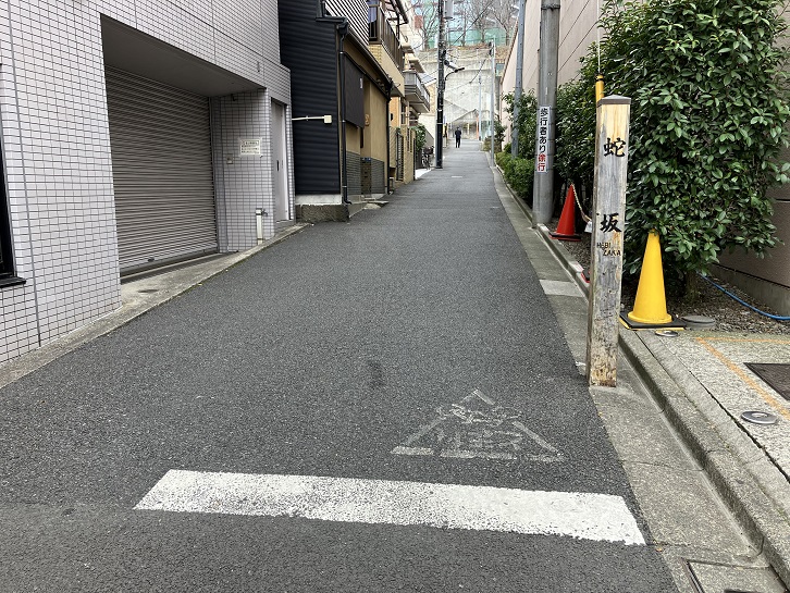 蛇坂は長さが約65mほどのやや急な坂です。付近の藪から蛇が出たことに因んで坂名が付けられました。坂上の曲がり角付近と坂下に案内柱が立っています。