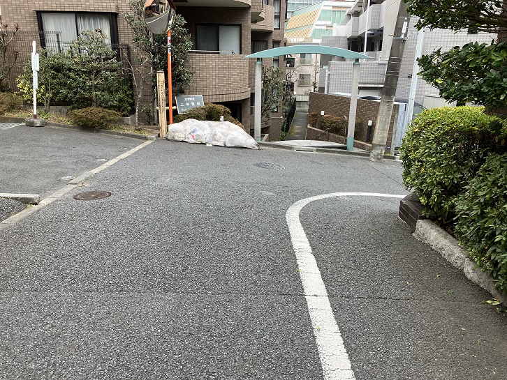 高輪ハイマンションの前で右折し、左右に曲がりながら坂が上っています。