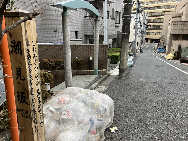 潮見坂は長さが約60mほどのやや急な坂で、別名は「汐見坂」といいます。かつて坂上から海が見え、潮の干満を知ることができたことに因んで坂名が付けられました。坂上の曲がり角付近と坂下に案内柱が立っています。