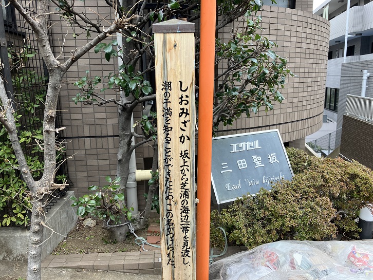 しおみざか 坂上から芝浦の海辺一帯を見渡し、潮の干満を知ることができたため、この名がつけられた。