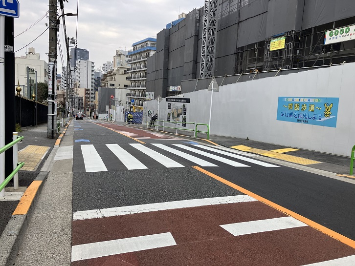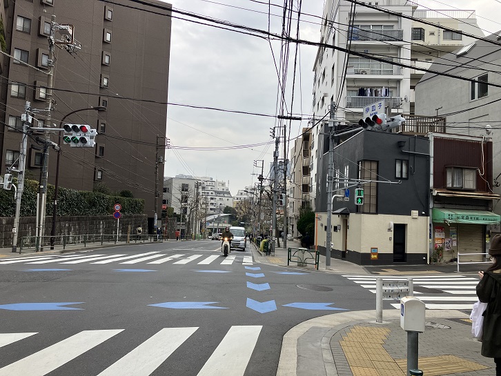 伊皿子交差点から泉岳寺方面に向かって道往寺手前の交差点まで坂が下っています。