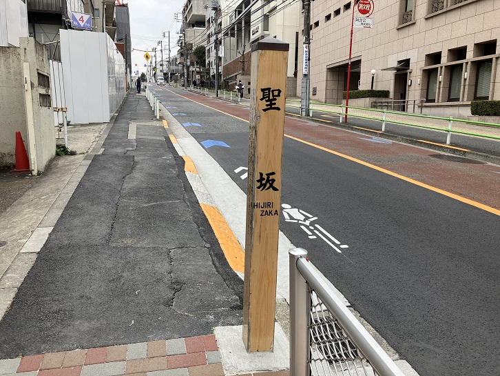 聖坂は長さが約400mほどの緩やかな坂で、坂の途中で僅かに左にカーブしています。別名は「非知坂・竹芝の坂」といいます。坂名の由来は、この坂を高野聖が開き、その宿所もあったことに因んでいます。坂下付近と坂上に案内柱が立っています。