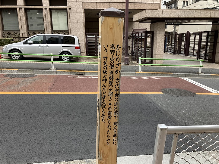ひじりざか 古代中世の通行路で、商人を兼ねた高野山の僧(高野聖)が開き、その宿所もあったためという。竹芝の坂と呼んだとする説もある。