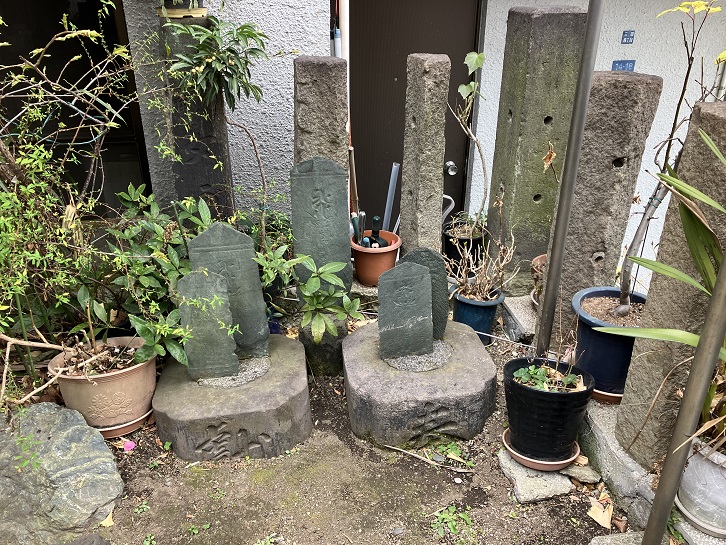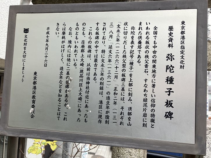 狭い境内の隅には「弥陀種子板碑」5基が建っています。中世の関東地方に多く見られる阿弥陀信仰に基づく供養石塔で、秩父青石(緑泥片岩)で作られています。5基のうちの3基については、鎌倉時代中期から南北朝時代前期にかけての文永三年(1266年)・正和二年(1313年)・延文六年(1361年)の年紀銘が確認できますが、残りの2基の銘は風化のため解読不能となっています。文永三年の碑は港区内で最古の板碑です。新田義貞一族の霊を弔うための碑だとも伝えられています。
