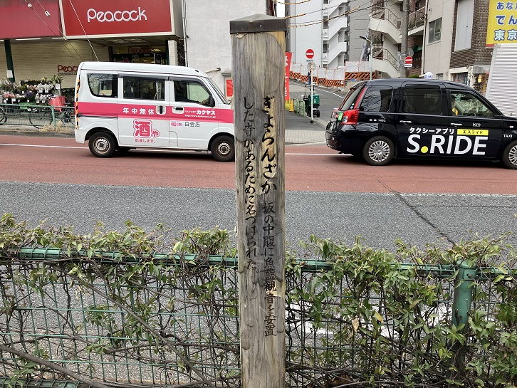 魚籃坂は長さが約260mほどの緩やかな坂で、坂名は坂の途中の東側にある魚籃寺に魚籃観音が祀られていることに因んで名付けられました。坂下付近と坂上の手前に案内柱が立っています。