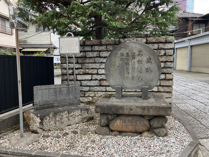 坂下付近にある「三味せん寺」と呼ばれる大信寺に三味線の始祖とされる石村近江の石碑が建っています。三味線の始祖とされる石村近江は、号を浄本・通称を源左衛門といい、京都から江戸に移住して三味線を完成し、「浄本近江」と呼ばれた名工でした。寛永十三年(1636年)3月2日に没し、大信寺に葬られました。
