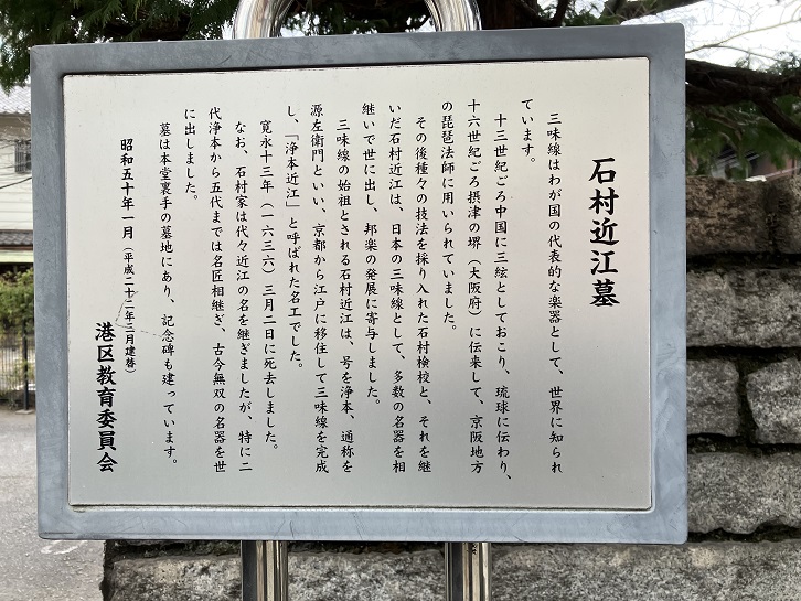 三味線はわが国の代表的な楽器として、世界に知られています。十三世紀ごろ中国に三絃としておこり、琉球に伝わり、十六世紀ごろ摂津の堺(大阪府)に伝来して、京阪地方の琵琶法師に用いられていました。その後種々の技法を採り入れた石村検校と、それを継いだ石村近江は、日本の三味線として、多数の名器を相継いで世に出し、邦楽の発展に寄与しました。三味線の始祖とされる石村近江は、号を浄本、通称を源左衛門といい、京都から江戸に移住して三味線を完成し、「浄本近江」と呼ばれた名工でした。寛永十三年(1636年)三月二日に死去しました。なお、石村家は代々近江の名を継ぎましたが、特に二代浄本から五代までは名匠相継ぎ、古今無双の名器を世に出しました。墓は本堂裏手の墓地にあり、記念碑も建っています。