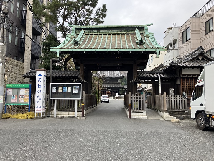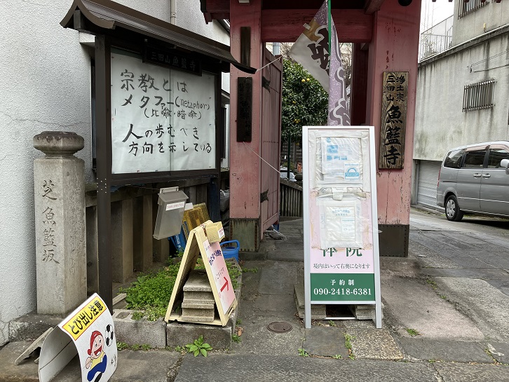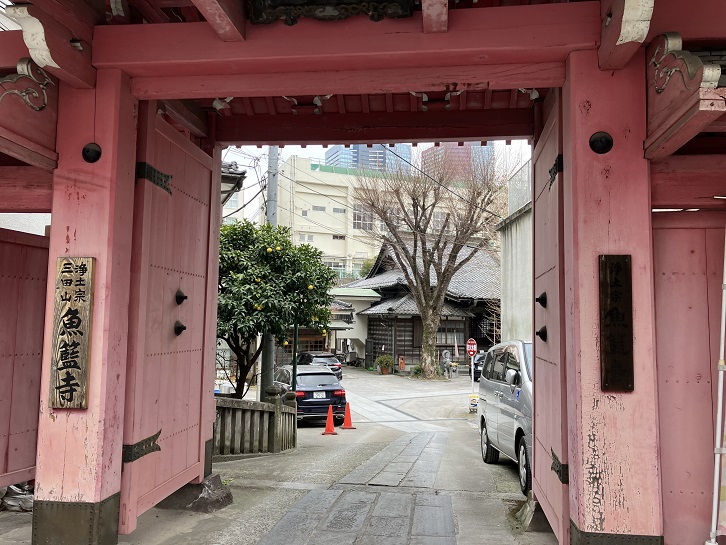 坂の中腹に、魚籃坂の坂名の由来となった(やや色あせていますが)朱色の山門が目立つ魚籃寺があります。門前には「芝魚籃坂」の石柱が置かれています。魚籃寺の本尊は「魚籃観世音菩薩」(空海作と口碑に残る、頭髪を唐様の髷に結った乙女の姿をした観音像)で、承応元年(1652年)に創建されました。
