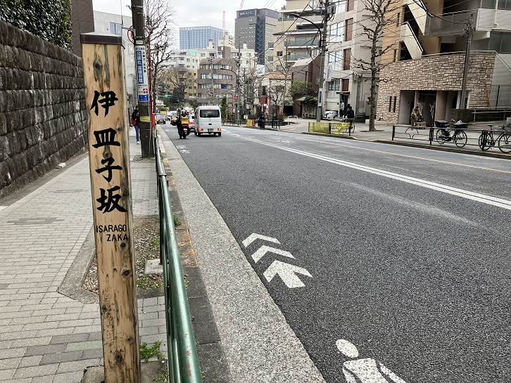 いさらござか 中国人伊皿子(いんべいす)が住んでいたと伝えるが、ほかに大仏(おさらぎ)のなまりとも”いいさらふ”(意味不明)の変化ともいう。
