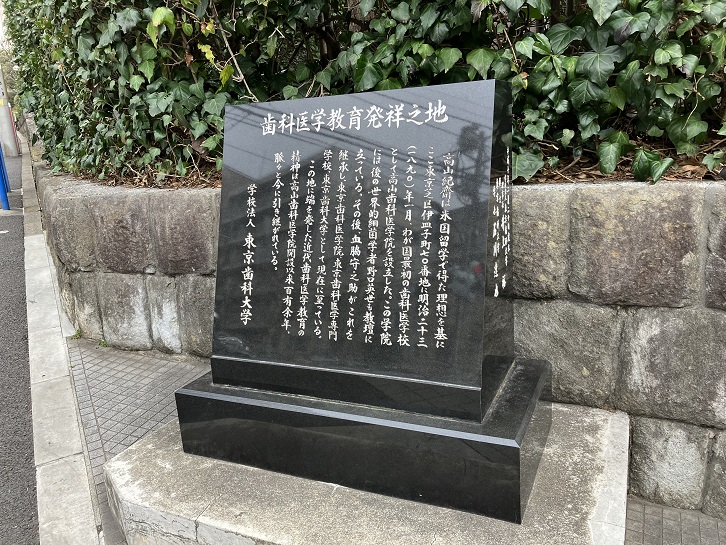 伊皿子交差点の角に「歯科医学教育発祥之地」と書かれた石碑が置かれています。