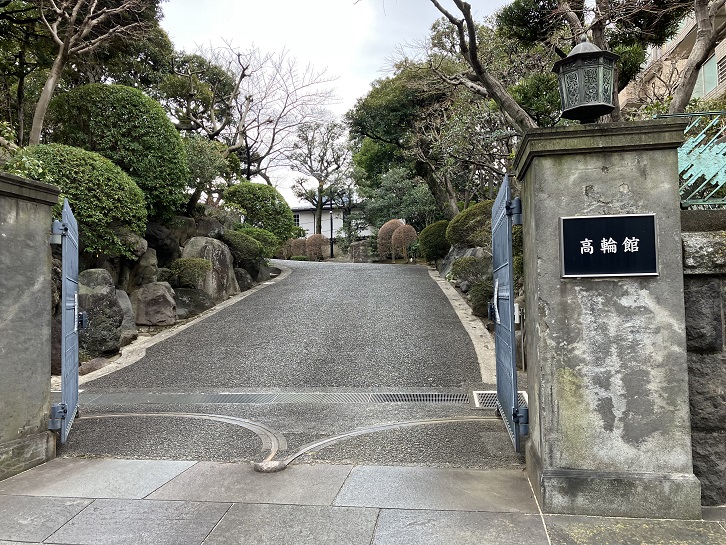 そのまま進みますと、右手に由緒ありげな屋敷があります。現在は「高輪館」という標札がかかっていますが、2016年に某テレビ局に売却される迄は東芝山口記念館という東芝グループの迎賓館でした。この屋敷は旧三井財閥で経営手腕を発揮した財界人の朝吹常吉の私邸として、米国人建築家のウィリアム・メレル・ヴォーリズの設計により大正十四年に建てられた英国調ながら外観にスパニッシュ様式を取り入れたヴォーリズ建築の洋風邸宅でした。邸宅は朝吹常吉邸として使用された後、旧加賀藩前田家を経て、東芝山口記念会館として東芝グループの賓客をお迎えする場として使用されていました。館内は1階にサロン・ダイニング・ティールーム、2階は会議室・ダイニング、地下1階はサロンなどで構成されていました。売却後の今でも建物自体はそのままの形で現在も残っています。