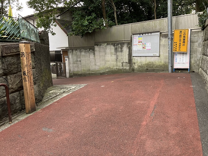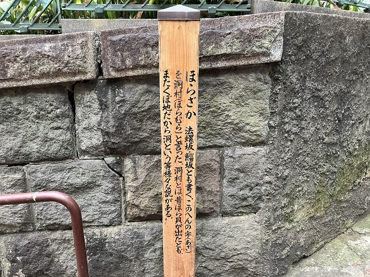 洞坂は長さが約45mほどの急な坂で、別名を「法螺坂・鯔坂」といいます。坂名の由来については、かってこの付近の地名が洞村であったことに因むとか、その他諸説があります。坂の中ほどの曲がり角付近と坂下に案内柱が立っています。