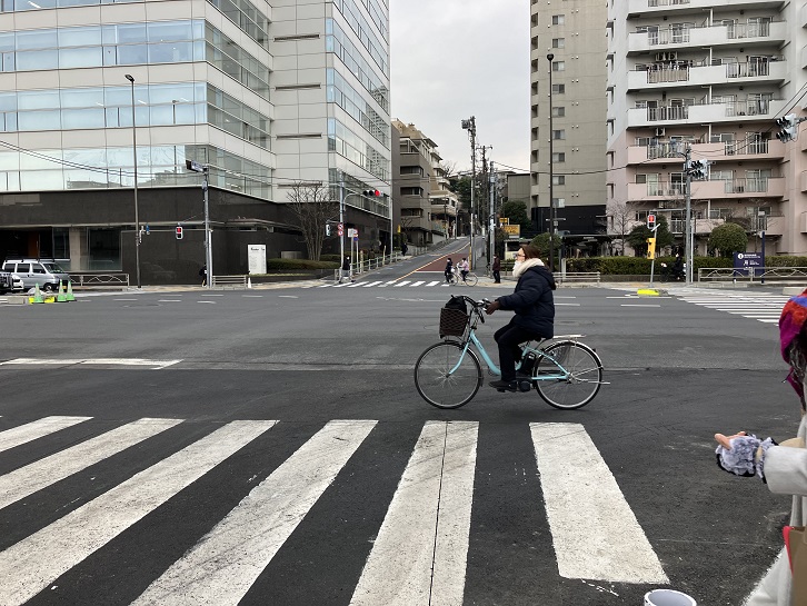 幽霊坂は長さが約230mほどの複雑に曲がりながら上がる坂です。途中までは緩やかな傾斜になっていますが、最後の区間は急勾配になっています。かっては海岸沿いに位置していた泉岳寺から高輪台地に向かって上がっていた坂で、現在は周囲一帯にマンションが林立していますが、昔は寂しい幽霊が出そうな抜け道だったことから、この坂名が付いたと思われます。坂上には港区立の高輪幼稚園があります。お子さんを後ろのチャイルドシートに座らせて、電動自転車は急坂をスイスイと上って行きます。母は強し!ですね。
