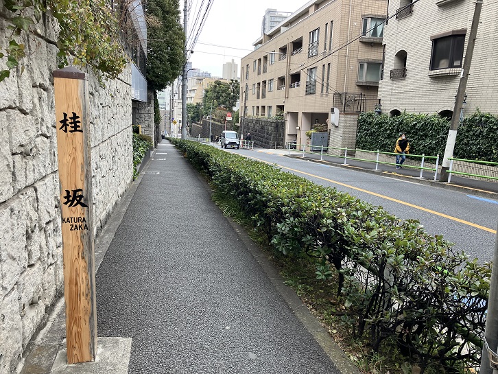 坂は途中で平坦になり、その先で再び下り坂になって桜田通りに突き当たっています。