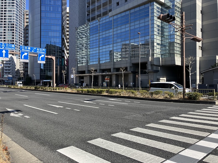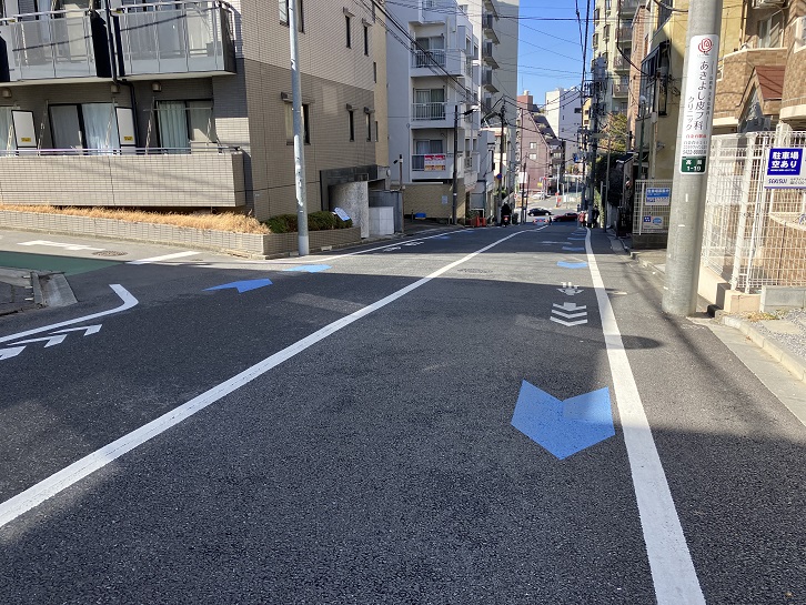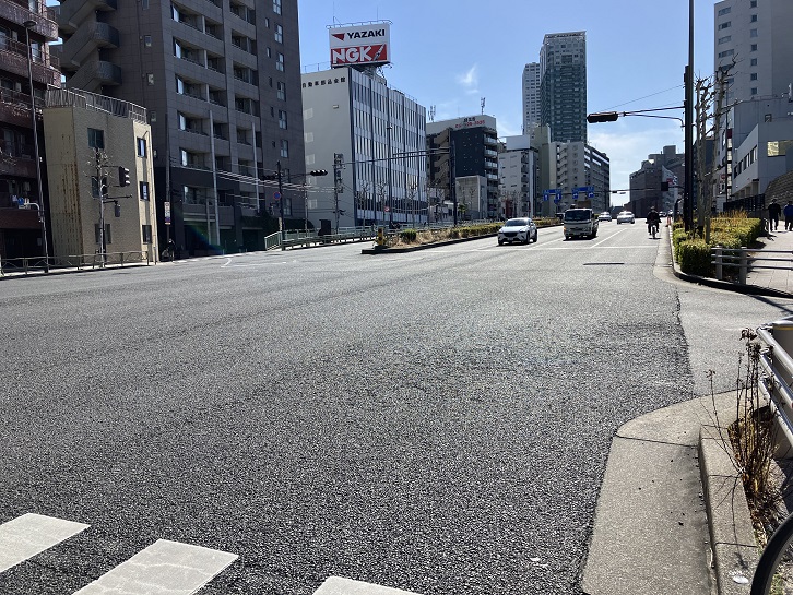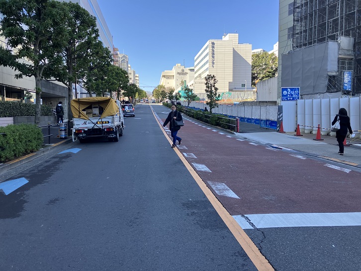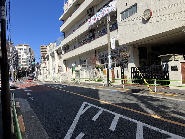 高松中学校の塀の端で道幅が半分になって桜田通りに出ます。