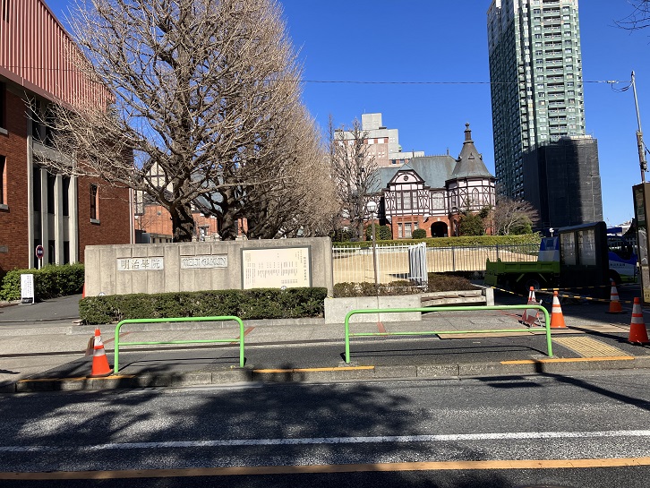 桜田通り(国道1号線)に出て、明治学院前交差点を左折します。明治学院大学は、ジェームス・カーティス・ヘボンが横浜で開いた「ヘボン塾」を起源となり、文久三年(1863年)に創立されました。日本で最古のキリスト教主義学校(ミッションスクール)で、戦後の昭和二十四年(1949年)に新制大学として発足し、現在では6学部15学科、7研究科を擁する純文系の大学となりました。令和六年(2024年)4月には、初の理系学部となる「情報数理学部」が新設される予定になっています。ちなみに、大学の名称である「明治」は時代名を指すのではなく、「明けき政治の時代の学問の学校」を目指すということから命名されたのだそうです。正門の奥に見える伝統ある建物は明治学院記念館です。明治学院記念館は、明治二十三年(1890年)に建てられたネオゴシック様式の建物で、1階の小チャペルは静かな黙想の場となっていて、19世紀につくられた足鍵盤付きリードオルガンが大正時代の音をいまも響かせています。建物は2002年度の「景観上重要な歴史的建造物等」として東京都から指定され、オルガンは港区の指定有形文化財になっています。