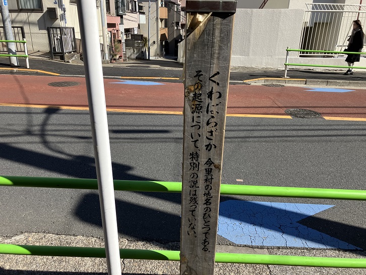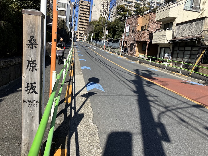 桑原坂は長さが約150mほどの緩やかな坂です。坂名の由来ははっきりしませんが、この芝白金の付近はかって今里村という地名で、その地名のひとつであった桑原が坂名になったといわれています。坂下と坂上に案内柱が立っています。