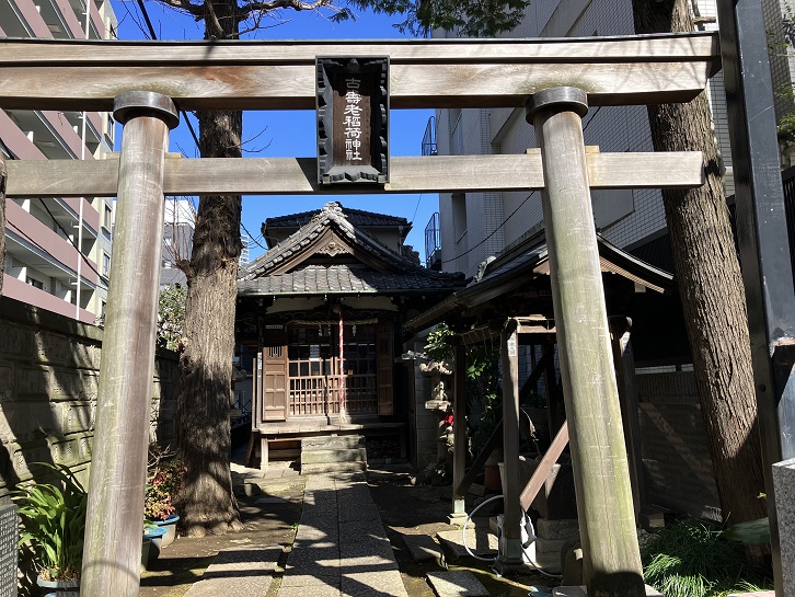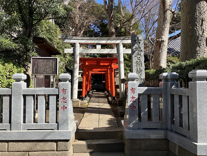 坂の中央付近に小さな稲荷神社があります。古壽老稲荷神社はかって麻布飯倉片町付近に鎮座していましたが、延宝六年(1678)頃に現在地に遷宮しました。「御府内備考」の三田代地(君塚町)の条に、「右に剣左に宝珠持、白狐に乗れる女之姿に相見え、里俗小女郎稲荷と唱来、弘法大師の作と申伝候」と記されていることから、俗に「小女郎稲荷」とも呼ばれています。昔から町内に失火が全くなく、神社を中心とする氏子を含む一帯は大正十二年の関東大震災や昭和二十年の東京大空襲ともに難を免れ、氏子中はもちろん、近隣の人びとも「火除の神」として崇敬の念が深いとのことです。古地老稲荷神社と似てますね。