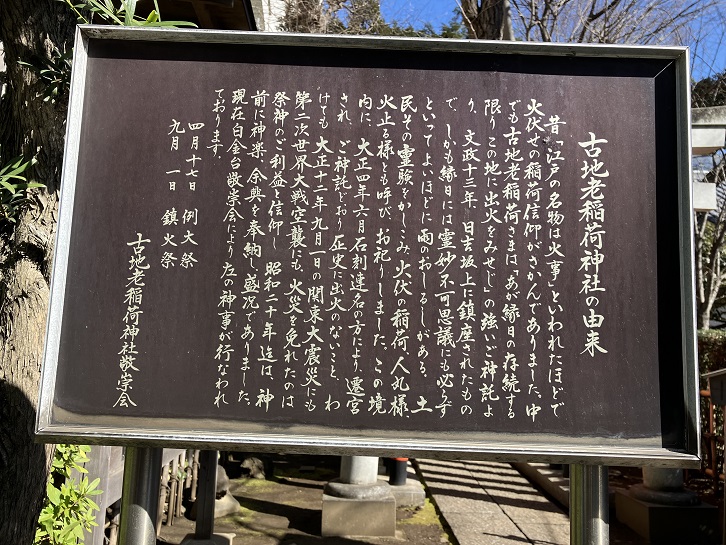 昔「江戸の名物は火事」といわれたほどで、火伏せの稲荷信仰がさかんでありました。中でも古地老稲荷さまは「あが縁日の存続する限りこの地に出火をみせじ」の強いご神託より、文政十三年、日吉坂上に鎮座されたもので、しかも縁日には霊妙不可思議にも必らずといってよいほどに雨のおしるしがある。土民その霊験をかしこみ、火伏の稲荷、人丸様、火止る様とも呼び、お祀りしました。この境内に、大正四年六月石刻連名の方により、遷宮され、ご神託どおり歴史に出火のないこと、わけても大正十二年九月一日の関東大震災にも第二次世界大戦空襲にも、火災を免れたのは祭神のご利益と信仰し、昭和二十年迄は、神前に神楽、余興を奉納し、盛況でありました。現在白金台敬崇会により左の神事が行なわれております。