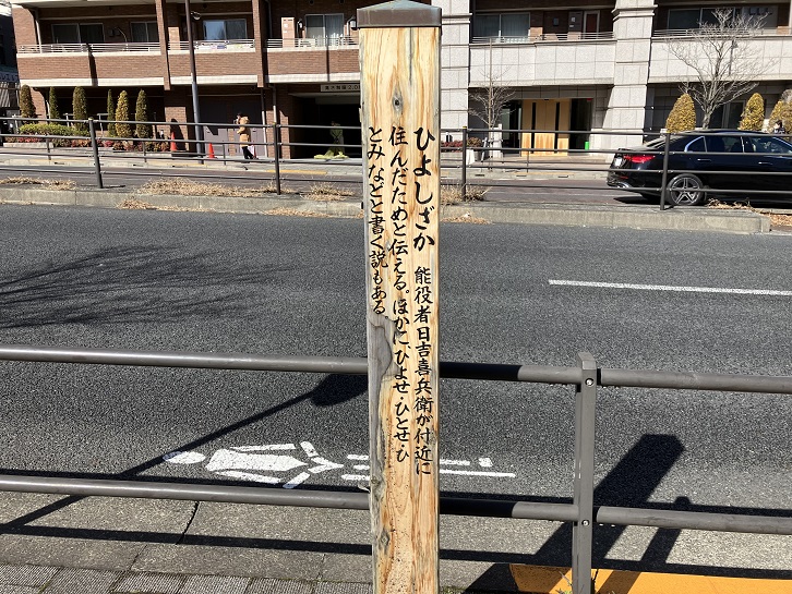 日吉坂は長さが約300mほどの緩やかな坂です。別名を「ひよせ坂・ひとみ坂・ひとせ坂」といいます。坂名の由来は、かって付近に能役者の日吉喜兵衛が住んでいたことに因みます。坂下の手前付近に案内柱が立っています。