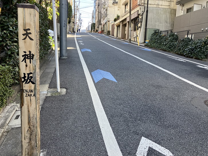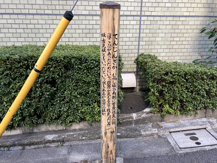 天神坂は長さが約90mほどの急な坂です。坂名の由来は、かって坂の南側に菅原道真の祠があったことに因みます。坂下と坂上付近に案内柱が立っています。